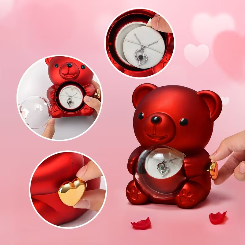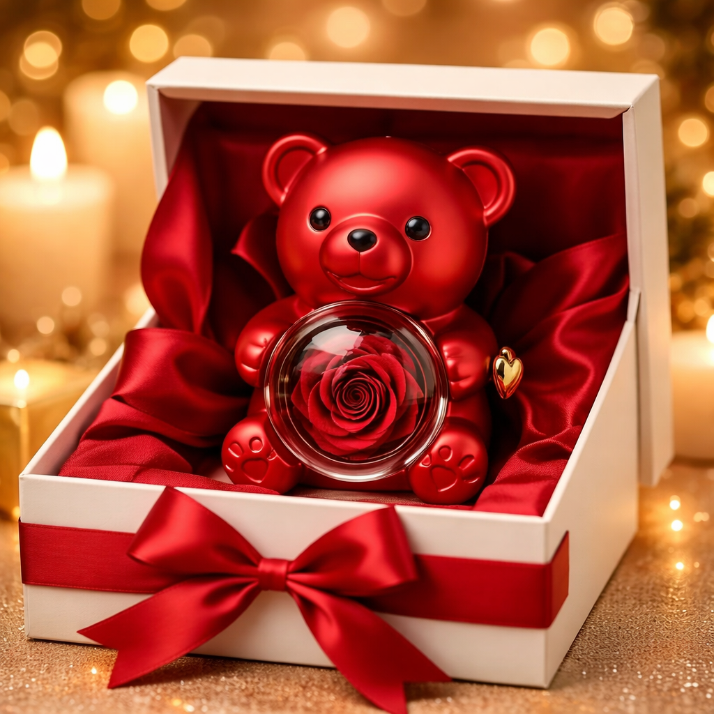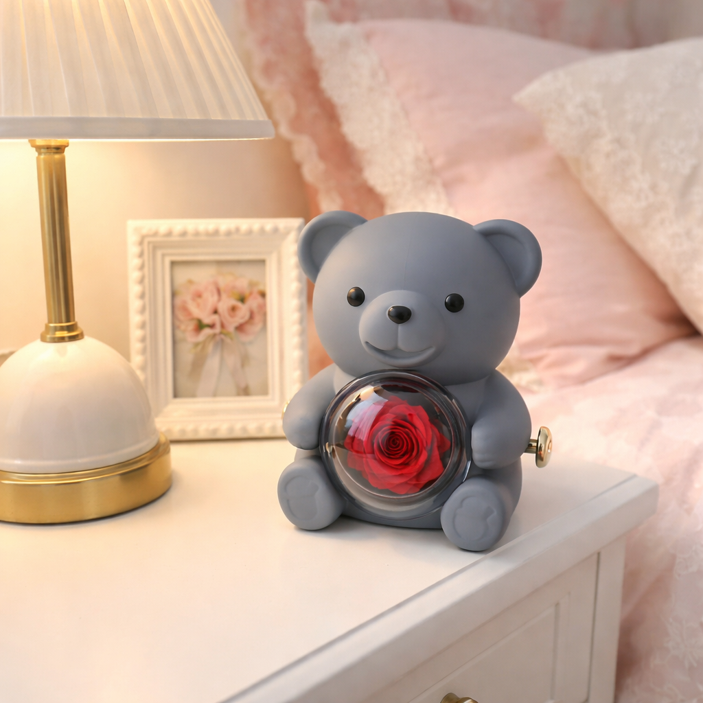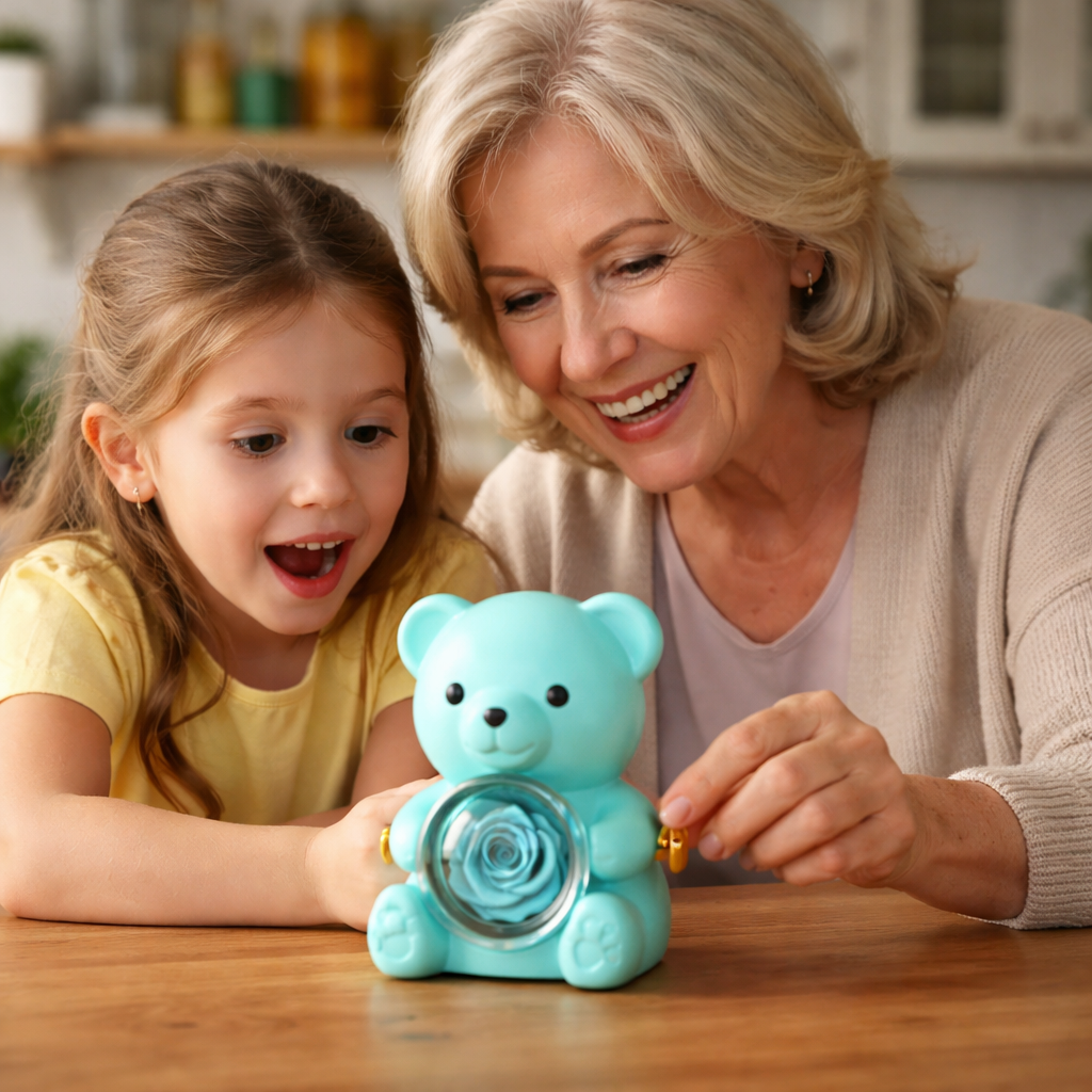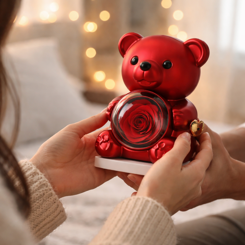 C'est la surprise de découvrir cet ourson élégant. L'émerveillement devant cette rose naturelle qui ne fanera jamais. Et l'émotion brute quand elle comprend que ce collier porte vos deux prénoms unis pour l'éternité.
