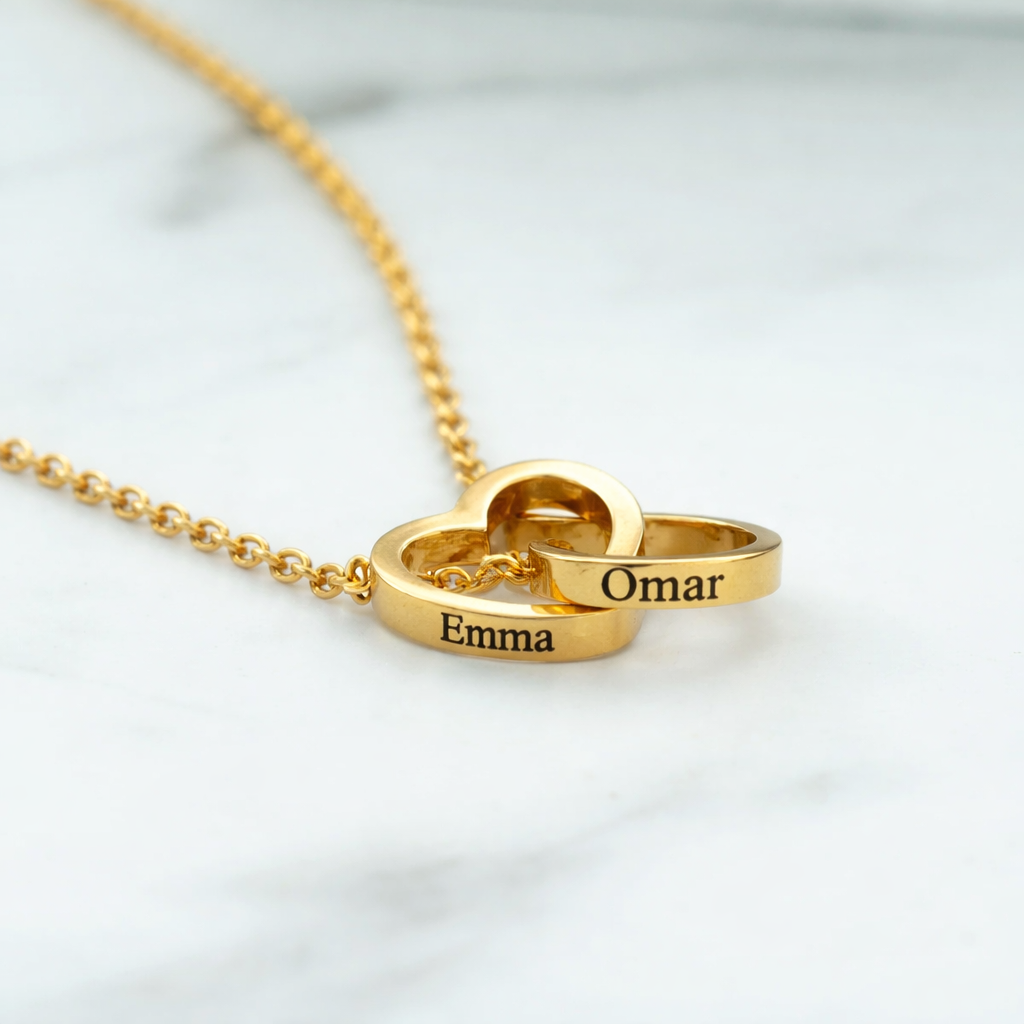 Puis elle aperçoit le collier caché à l'intérieur. Vos deux prénoms gravés sur ces cœurs entrelacés.